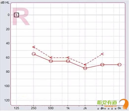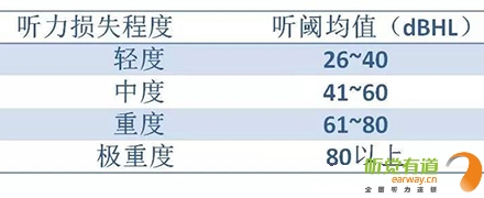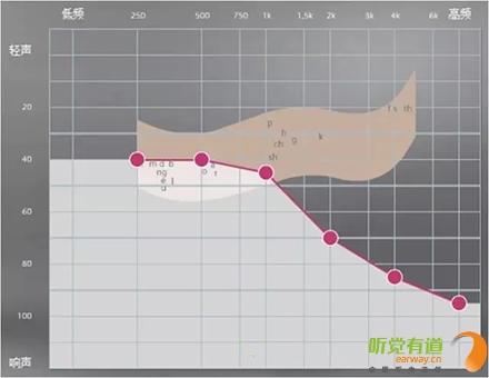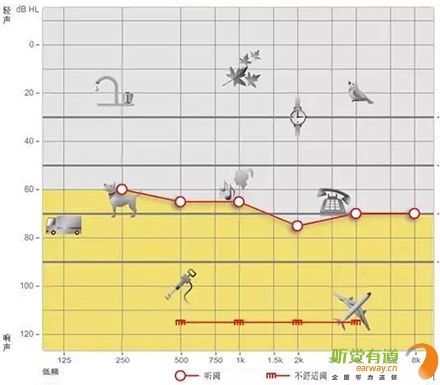 <span style="font-size:16px;"> 純音測試聽力圖的橫坐標(biāo)為頻率,從左至右表示測試聲的頻率從低到高,即125Hz至8000Hz;縱坐標(biāo)為強(qiáng)度,從上至下表示受試者能聽到的最小的聲音強(qiáng)度,以dBHL為單位。如下圖所示:</span></p><center><span style="font-size:16px;"><img alt="" src="/upfiles/201810080127399978.png" width="440" height="400" /></span></center><p></p><p><span style="font-size:16px;"> 聽力圖的畫法自從1943年在C.C.Bunch的著作中出現(xiàn)后,至今沒有改變。通常右耳的測試結(jié)果用紅色表示,左耳用藍(lán)色。下圖是ASHA(1990)建議使用的各種標(biāo)記符號,這些符號已在世界各地廣泛使用。</span></p><center><span style="font-size:16px;"><img alt="" src="/upfiles/201810080127444763.png" width="440" height="250" /></span></center><p></p><p><span style="font-size:16px;"> 純音測試的測試項目有氣導(dǎo)、骨導(dǎo)、舒適閾與不舒適閾。那么這簡簡單單的聽力圖在驗配過程中有哪些重要作用呢?</span></p><p><span style="font-size:16px;"> 1、確定聽力損失程度</span></p><p><span style="font-size:16px;"> 按照世界衛(wèi)生組織(WHO)1997年的標(biāo)準(zhǔn),根據(jù)0.5kHz、1kHz、2kHz、和4kHz氣導(dǎo)平均聽閾值,將聽力損失分為輕度、中度、重度和極重度。</span></p><center><span style="font-size:16px;"><img alt="" src="/upfiles/20181008012749435.png" width="440" height="180" /></span></center><p></p><p style="text-align: center;"><span style="font-size:16px;color:#999999;">世界衛(wèi)生組織(WHO-1997)的聽力障礙分級標(biāo)準(zhǔn)</span></p><p style="text-align: left;"><span style="font-size:16px;"> 下圖為某一聽力損失者所測得的聽力圖</span></p><center><span style="font-size:16px;"><img alt="" src="/upfiles/201810080127552977.png" width="440" height="380" /></span></center><p></p><p><span style="font-size:16px;"> 0.5kHz的聽閾為65dBHL,1kHz的聽閾為65dBHL,2kHz的聽閾為75dBHL,4kHz的聽閾為70dBHL。則平均聽閾為(65+65+75+70)/4=68.75。將68.75dBHL代入以上分級表格,得到該聽力損失者的損失程度為重度。 聽力損失程度的確定有利于確定助聽器的功率。</span></p><p><span style="font-size:16px;"> 2、判斷聽力損失性質(zhì)</span></p><p><span style="font-size:16px;"> 根據(jù)氣導(dǎo)、骨導(dǎo)的關(guān)系,可將聽力損失分為傳導(dǎo)性聽力損失、感音神經(jīng)性聽力損失及混合性聽力損失。</span></p><p><span style="font-size:16px;"> 骨導(dǎo)與氣導(dǎo)之差大于10dB,且骨導(dǎo)在正常范圍內(nèi)為傳導(dǎo)性聽力損失,表明聽力下降是由外耳、中耳病變引起。</span></p><p><span style="font-size:16px;"> 氣骨導(dǎo)一致(≤10dB)且都在正常范圍之外為感音神經(jīng)性聽力損失。表明聽力下降是由耳蝸、聽神經(jīng)損傷引起。</span></p><p><span style="font-size:16px;"> 骨導(dǎo)與氣導(dǎo)之差大于10dB,但骨導(dǎo)在正常范圍之外為混合性聽力損失,表明以上兩種聽力損失均有,由上述多種部位病變引起聽力下降。確定聽力損失性質(zhì)還需結(jié)合臨床表現(xiàn),也有助于助聽器佩戴效果的預(yù)測。</span></p><p><span style="font-size:16px;"> 3、解釋聽力損失者的日常生活困難</span></p><p><span style="font-size:16px;"> 聽力損失者在日常生活中經(jīng)常遇到的問題有1)時而聽得到,時而聽不到;2)聽得到,聽不清;3)小聲聽不到,大聲受不了。</span></p><p><span style="font-size:16px;"> 時而聽得到時而聽不到</span></p><p><span style="font-size:16px;"> 以下圖平坦型聽力曲線為例,當(dāng)周圍言語聲高于其聽閾,即處于曲線下方區(qū)域時,該聽力損失者能聽到;當(dāng)周圍言語聲低于其聽閾,即處于曲線上方區(qū)域時,聽力損失者則聽不到對方的說話聲。此為“時而聽得到,時而聽不到”。</span></p><center><span style="font-size:16px;"><img alt="" src="/upfiles/201810080128042378.png" width="440" height="340" /></span></center><p></p><p><span style="font-size:16px;"> 聽得到 聽不清</span></p><p><span style="font-size:16px;"> 中文漢語元音輔音的頻率及響度有其分布圖,如下圖所示。以陡降型聽力曲線為例,該聽力損失者聽不到大部分的輔音。聽得清不清楚,主要取決于高頻輔音聽得到聽不到。例如該聽力損失者“g”、“ch”聽不到,但“u”能聽到,因此,他會將“姑姑”、“出租”都聽成“uu”。聽不清楚時,再結(jié)合口型,前后句的冗余度猜測。猜對則談話繼續(xù),猜錯則打岔。兒童聽力曲線若是如此,長期接收不正確的語音,會出現(xiàn)口齒不清。</span></p><center><span style="font-size:16px;"><img alt="" src="/upfiles/201810080128148209.png" width="440" height="340" /></span></center><p></p><p><span style="font-size:16px;"> 小聲聽不到 大聲受不了</span></p><p><span style="font-size:16px;"> 小聲聽不到,大聲受不了是重振現(xiàn)象。以下圖聽力曲線為例,“飛機(jī)”處于不舒適閾附近,聽力損失者對“飛機(jī)”的聲音聽著受不了。另外,該聽力損失者聽不到“手表”等聲音。</span></p><center><span style="font-size:16px;"><img alt="" src="/upfiles/201810080128202005.png" width="440" height="385" /></span></center><p></p><p><span style="font-size:16px;"> 為了更好地使聽力損失者家屬明白聽力損失者的困難,目前有較多的工具可以模擬聽力損失狀態(tài)下的溝通與交流。</span></p><center><span style="font-size:16px;"><img alt="" src="/upfiles/201810080128265518.png" width="440" height="370" /></span></center><p></p><p><span style="font-size:16px;"> 比如,在聲音樣本中選擇“餐廳”,并選擇“正常”,可聽到正常