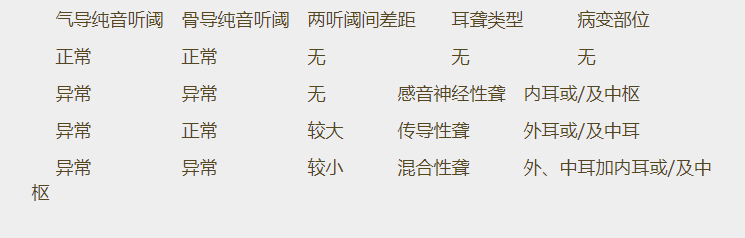 純音聽力檢查結果體現為純音聽力圖。</p><p> 正常情況下我們是通過兩條途徑來感受聲音信號的——氣導途徑和骨導途徑。前者我們非常熟悉,從外耳到中耳到內耳到聽中樞;后者我們或許不太注意:從顱骨直接到內耳到聽中樞。相應地,純音聽力檢查也有兩種聲音剌激方式,氣導輸入和骨導輸入。前者我們天天使用,而后者則很少被我們使用。事實上,兩閾值曲線的異同正是我們判斷聽損病變部位的基礎(見下表)。了解患者病變部位對于獲得他們的信任以及確定助聽器電聲性能都有非同尋常的意義。因此,有條件的時候還是應當重視骨導聽閾測試。</p><p style="text-align: center;"><img src="/upfiles/201906100237368907.png" alt="" /><br /></p><p> 更多詳情請登錄聽覺有道助聽器www.dequnsm.cn</p>" />