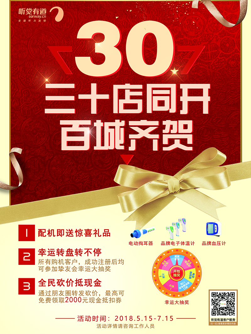 <span style="font-size:16px;"><img src="/upfiles/201805140533309372.jpg" alt="" /><br /></span></p><p style="text-align: center;"><span style="font-size:16px;"><br /></span></p><p><span style="font-size:16px;"> 聽覺有道助聽器驗配中心30家門店于5月15日正式開業,百城同慶!</span></p><p><span style="font-size:16px;"> 聽覺有道是一家高端、專業的全國聽力連鎖機構,有著近30年的助聽器驗配經驗,是廣東聽覺有道企業管理有限公司旗下品牌。</span></p><p><span style="font-size:16px;"> 公司現有專家級驗配師400多名,驗配服務中心遍布華西、華東、華南、華北主要省市,同時與GN集團進行戰略合作,代理美國貝爾通助聽器等助聽器品牌,擁有多條產品線:聽力篩查聽力篩查,聽力診斷,平衡診斷,助聽器驗配及專家級軟件(聽力診斷設備操作系統與患者信息服務管理系統),行業內領先的無線藍牙助聽器通訊技術,為聽障朋友提供一站式助聽器驗配解決方案!</span></p><p><span style="font-size:16px;"> 作為助聽器驗配行業的專業服務者,專業的驗配環境,專家級的驗配師,將時刻秉承專業全面的服務、豐富的驗配經驗及先進的驗配設備,同時為聽障朋友提供康復指導及助聽器售后服務,讓聽障朋友更好更放心地傾聽!</span></p><p style="text-align: center;"><span style="font-size:16px;"> <strong>我們的新門店地址(30家):</strong></span></p><p><span style="font-size:16px;"></span></p><p></p><p style="text-align: center;"><span style="font-size:16px;"> <strong>聽覺有道華南高端驗配中心</strong></span></p><p style="text-align: center;"><span style="font-size:16px;"><strong><img src="/upfiles/201805151039587785.png" alt="" /><br /></strong></span></p><p style="text-align: center;"><span style="font-size:16px;"> 電話:020-87066099</span></p><p style="text-align: center;"><span style="font-size:16px;"> 地址:廣州市天河區體育東路122號羊城國際商貿中心西塔1108(地鐵體育中心B出口前行100米,專家坐診,只接受預約)</span></p><p style="text-align: center;"><span style="font-size:16px;"><br /></span></p><p style="text-align: center;"><span style="font-size:16px;"> <strong>聽覺有道內蒙古呼市烏蘭察布服務中心</strong></span></p><p style="text-align: center;"><span style="font-size:16px;"><strong><img src="/upfiles/201805151040168591.png" alt="" /><br /></strong></span></p><p style="text-align: center;"><span style="font-size:16px;"> 電話:0471-3977839、13514714042</span></p><p style="text-align: center;"><span style="font-size:16px;"> 地址:內蒙古呼和浩特市賽罕區烏蘭察布東街路北(招商考試中心旁)</span></p><p style="text-align: center;"><span style="font-size:16px;"><br /></span></p><p style="text-align: center;"><span style="font-size:16px;"> <strong>聽覺有道成都金堂服務中心</strong></span></p><p style="text-align: center;"><span style="font-size:16px;"><strong><img src="/upfiles/201805151040458276.png" width="500" alt="" /><br /></strong></span></p><p style="text-align: center;"><span style="font-size:16px;"> 電話:17780478558</span></p><p style="text-align: center;"><span style="font-size:16px;"> 地址:成都市金堂縣趙鎮十里大道300號(一橫道路口)</span></p><p style="text-align: center;"><span style="font-size:16px;"><br /></span></p><p style="text-align: center;"><span style="font-size:16px;"> <strong>聽覺有道四川雅安服務中心</strong></span></p><p style="text-align: center;"><span style="font-size:16px;"><strong><img src="/upfiles/201805151041171639.png" alt="" /><br /></strong></span></p><p style="text-align: center;"><span style="font-size:16px;"> 電話:17738307596</span></p><p style="text-align: center;"><span style="font-size:16px;"> 地址:雅安市雨城區大南街22號(天主教堂對面)</span></p><p style="text-align: center;"><span style="font-size:16px;"><br /></span></p><p style="text-align: center;"><span style="font-size:16px;"></span></p><p style="text-align: center;"><span style="font-size: 16px;"> <strong>聽覺有道東營廣饒服務中心</strong></span></p><p style="text-align: center;"><span style="font-size: 16px;"><strong><img src="http://www.dequnsm.cn/upfiles/20180515104347120.png" alt="" /><br /></strong></span></p><p style="text-align: center;"><span style="font-size: 16px;"> 電話:0546-6281512</span></p><p style="text-align: center;"><span style="font-size: 16px;"> 地址:東營市廣饒縣花苑路與兵圣路十字路口東行20米路北(醫藥公司對面)</span></p><p style="text-align: center;"><span style="font-size: 16px;"><br /></span></p><p style="text-align: center;"><span style="font-size: 16px;"> <strong>聽覺有道河南洛陽服務中心</strong></span></p><p style="text-align: center;"><span style="font-size: 16px;"><strong><img src="http://www.dequnsm.cn/upfiles/201805151044003400.png" alt="" /><br /></strong></span></p><p style="text-align: center;"><span style="font-size: 16px;"> 電話:0379-64324338、16637990858</span></p><p style="text-align: center;"><span style="font-size: 16px;"> 地址:河南省洛陽市澗西區景華路8號(潤峰廣場正對面)</span></p><p style="text-align: center;"><span style="font-size: 16px;"><br /></span></p><p style="text-align: center;"><span style="font-size: 16px;"> <strong>聽覺有道山東聊城服務中心</strong></span></p><p style="text-align: center;"><span style="font-size: 16px;"><strong><img src="http://www.dequnsm.cn/upfiles/201805151044136324.png" alt="" /><br /></strong></span></p><p style="text-align: center;"><span style="font-size: 16px;"> 電話:0635-8800602,15653110810</span></p><p style="text-align: center;"><span style="font-size: 16px;"> 地址:山東省聊城市東昌府區興華西路2號(五星百貨斜對面)</span></p><p style="text-align: center;"><span style="font-size: 16px;"><br /></span></p><p style="text-align: center;"><span style="