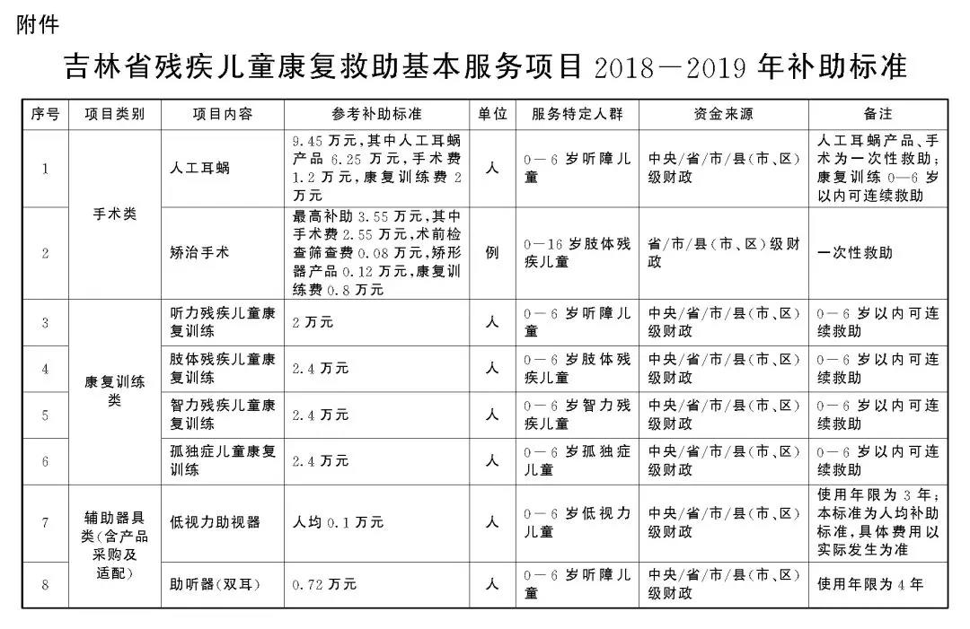 救助內(nèi)容包括以減輕功能障礙、改善功能狀況、增強(qiáng)生活自理和社會(huì)參與能力為主要目的的手術(shù)、輔助器具配置和康復(fù)訓(xùn)練等。救助服務(wù)項(xiàng)目及補(bǔ)助標(biāo)準(zhǔn)依據(jù)年度《吉林省殘疾兒童康復(fù)救助基本服務(wù)項(xiàng)目補(bǔ)助標(biāo)準(zhǔn)》執(zhí)行。